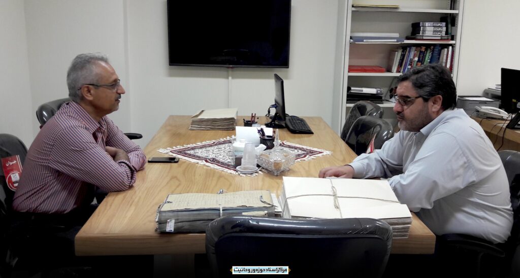 جلسه مسئول مرکز اسناد با آقای مصطفی محفوظی استاد دانشگاه و فهرست نگار کتاب و اسناد در خصوص همکاری در فهرست نویسی اسناد موجود در مرکز اسناد حوزه و روحانیت .